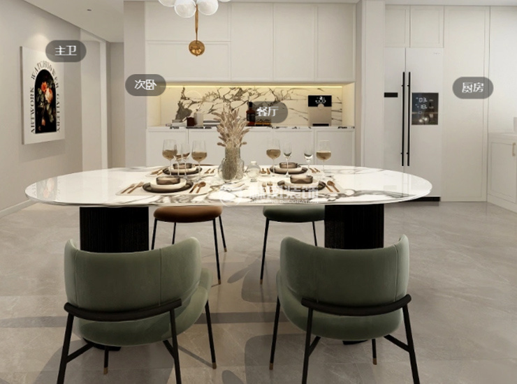 开放式厨房易积油,换成全嵌入式冰箱、洗碗机,机身与橱柜齐平,减少卫生死角。水槽选台下盆设计,台面水渍一抹即净,避免台上盆边缘藏污纳垢。灶台周围贴防油贴纸,定期更换省去擦油污的麻烦。